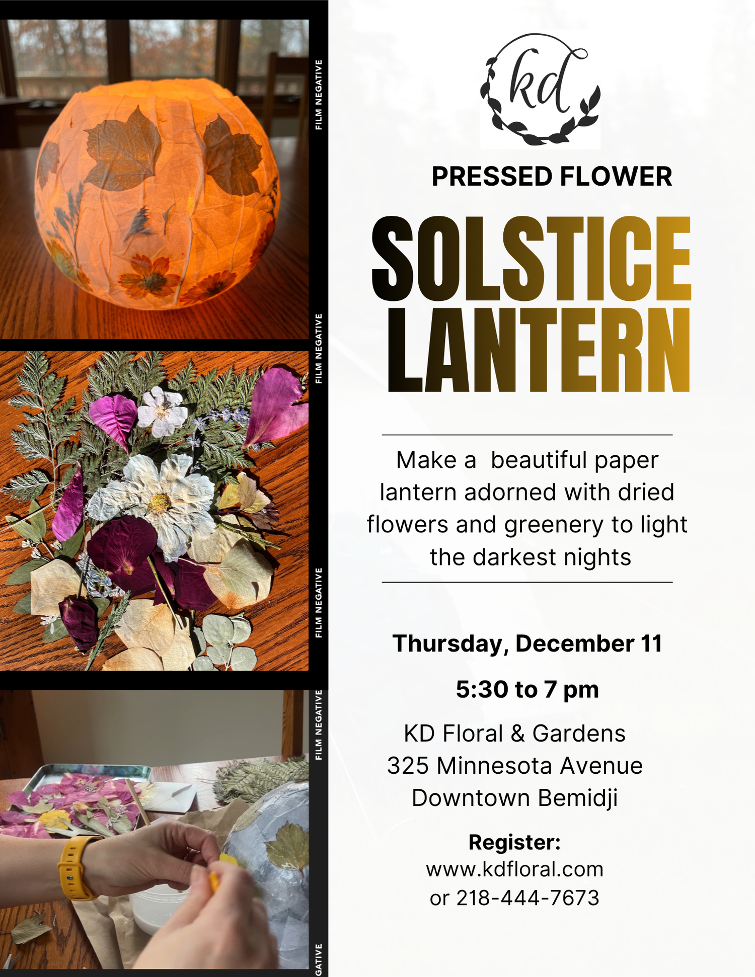 Join us on December 11th at KD Floral to create your own Solstice Lantern! No experience or materials needed, we will supply everything you need.